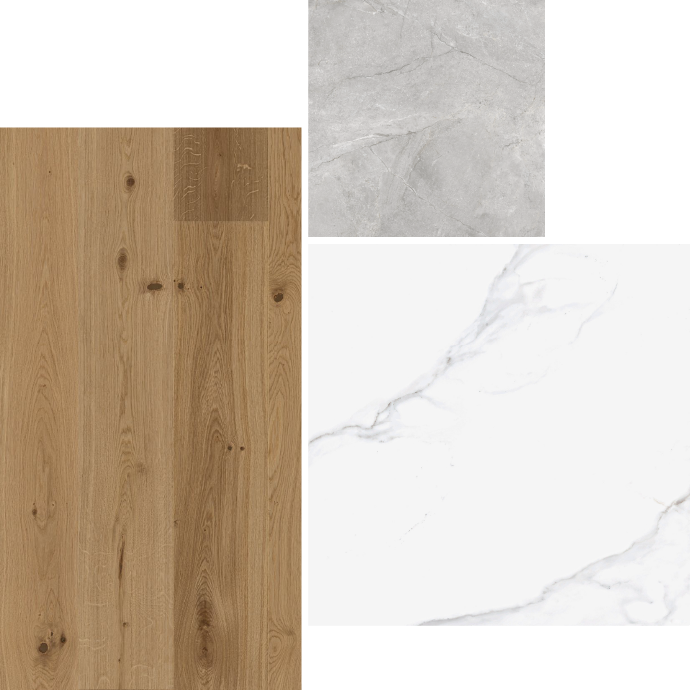 Rocca Towersi kodudes katab põrandaid vastupidav 1-lipiline valgendatud tamme tooni laminaatparkett, mis püsib kaunina ka aastate pärast. Duširuumides on stiilsed betooni mustriga keraamilised plaadid. Sanitaartehnika on Hansgrohe uhiuuest moodsa joonega tooteseeriast, mis on pärjatud mainekate disainiauhindadega ning on samaaegu veesäästlik. Sanitaarkeraamika on Šveitsi tootja Laufen valikust.